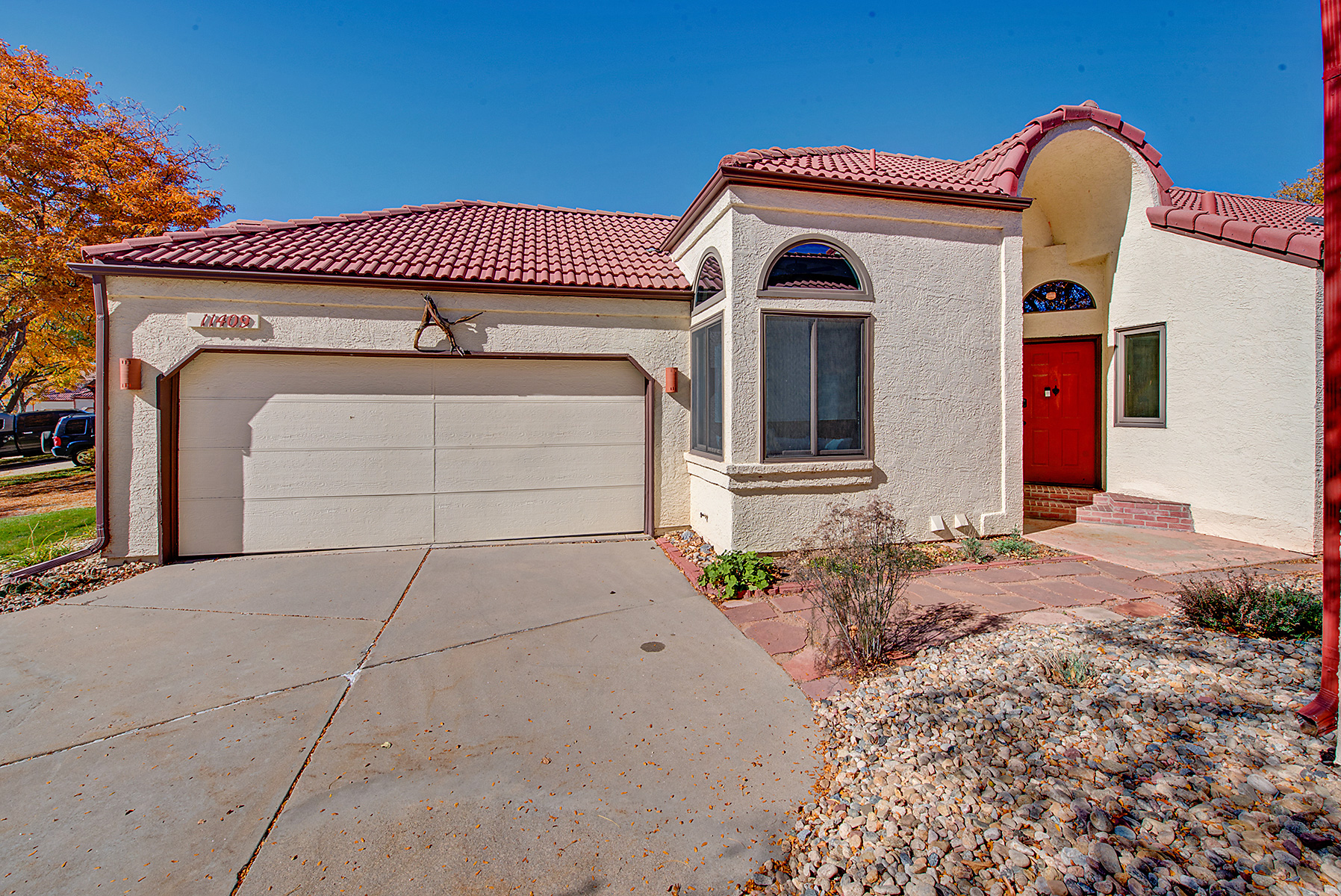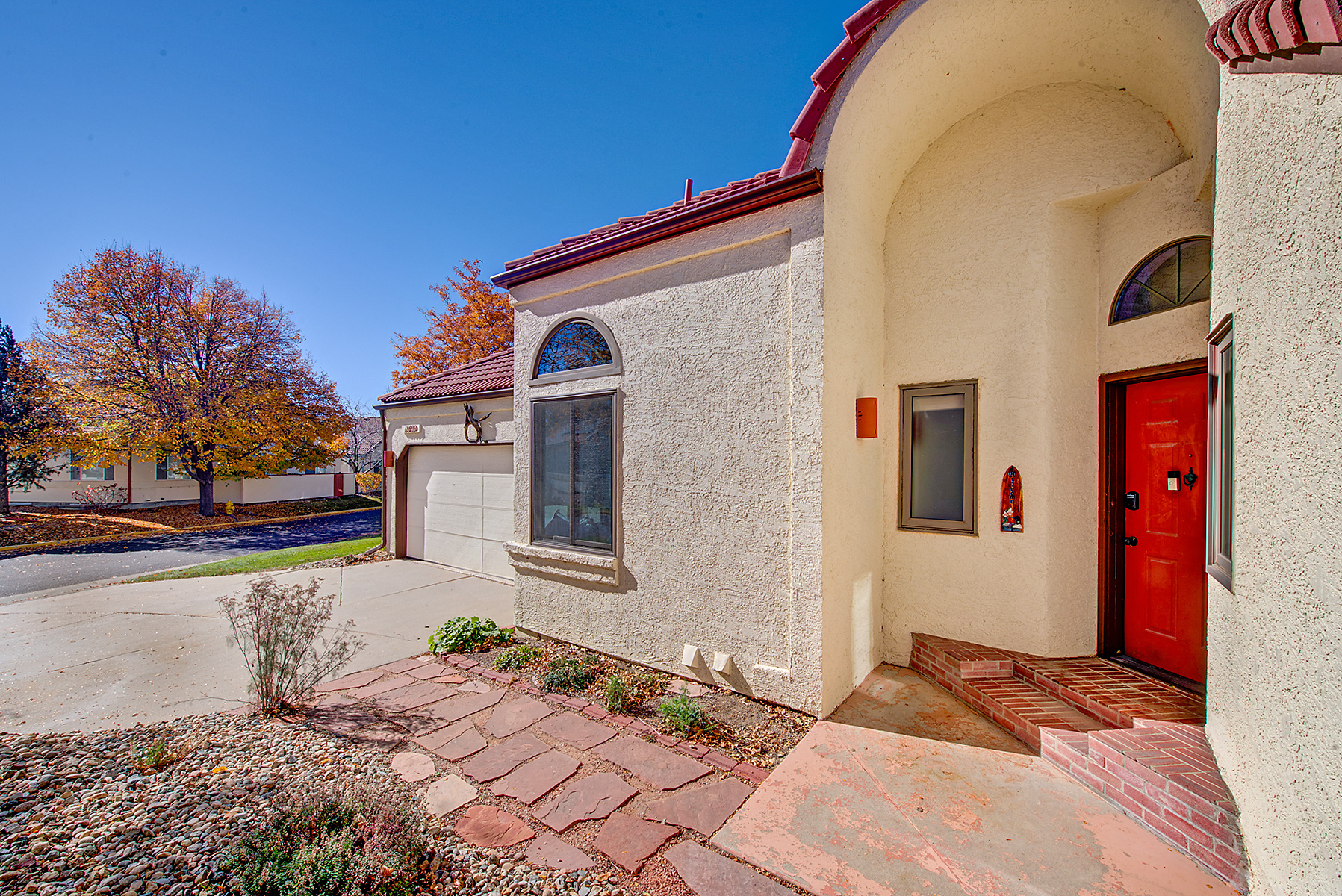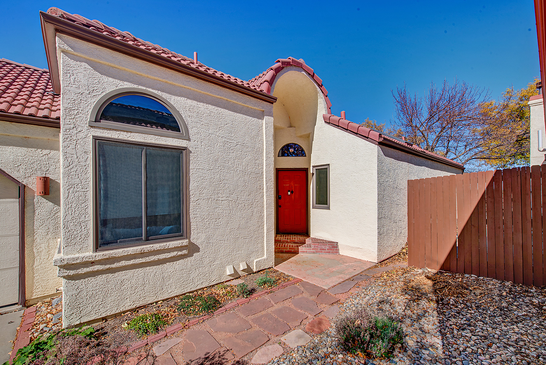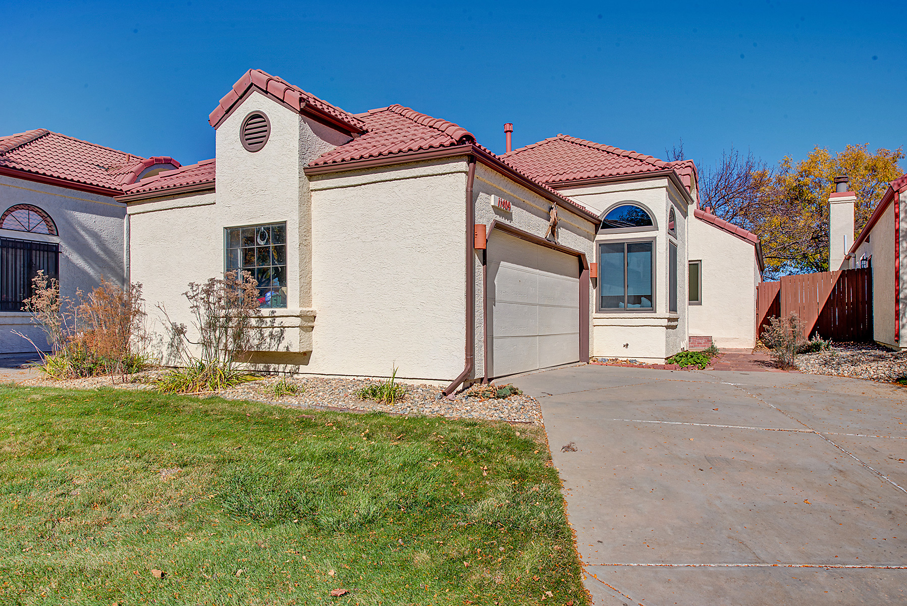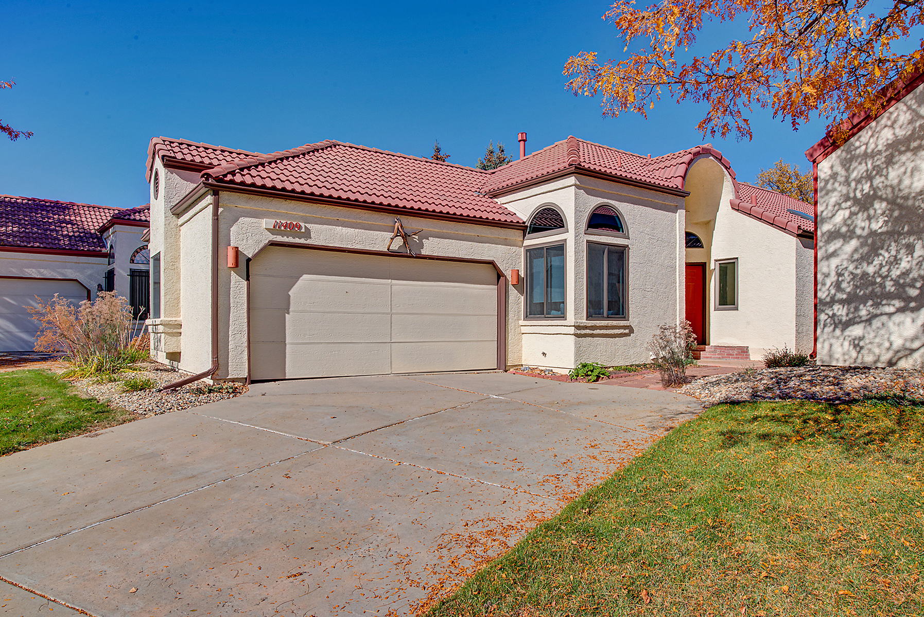 Welcome to this charming Spanish-style ranch home in the desirable Villages of San Marino! Enjoy low-maintenance living with the HOA taking care of front yard landscaping, irrigation, and snow removal, while the backyard is xeriscaped and features eco-friendly native plants. There are gorgeous hardwood floors throughout most of the main level as well as an open layout connecting the kitchen, dining area, and living room. The kitchen has an eat-in area and access to the side yard. The home has been freshly painted. Vaulted ceilings, skylights, and a wood-burning fireplace create a bright and comfortable space, and the living room and back deck both offer mountain views. The home includes a large primary suite with deck access and a four-piece bath, while the second bedroom and full bath are located on the opposite side of the house from the primary suite, providing added privacy. The unfinished basement has a rough-in for a bathroom, features egress windows and provides room to expand. The washer and dryer are currently in the basement, but some homes in the community have moved them to the main level with minimal effort, making this home easy to convert to all main floor living, if that's your desire. The home also has an attached 2-car garage, lots of storage space, and has a fully-fenced private backyard. Residents enjoy access to a community pool and nearby amenities include Excel Academy, Standley Lake, and Little Dry Creek Trail—all within walking distance. The Apex Center, Standley Lake Library, shops, and restaurants are also close by. Homes in this community rarely come on the market, making this a great opportunity to own in the Villages of San Marino!
