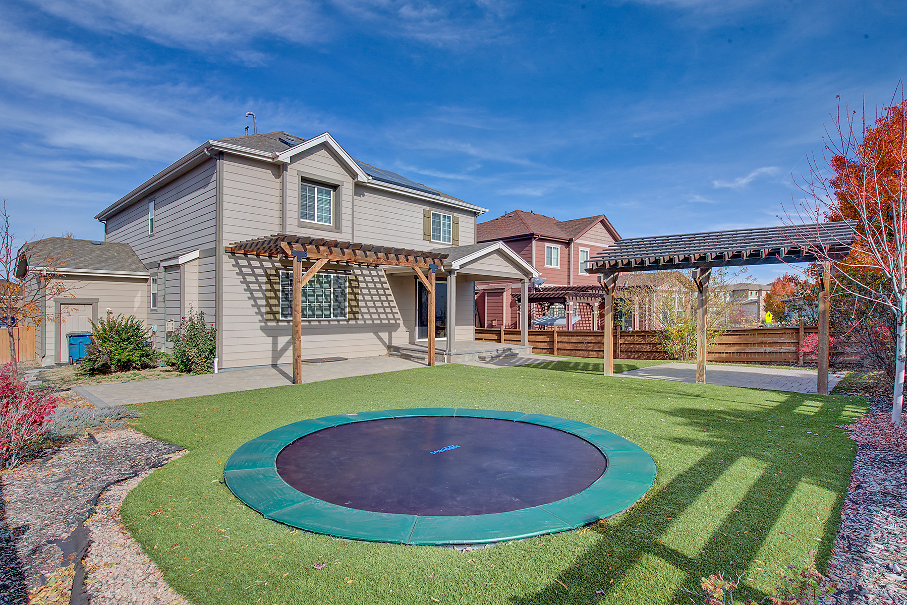 Low maintenance backyard with low artificial turf, inground trampoline and multiple pergolas