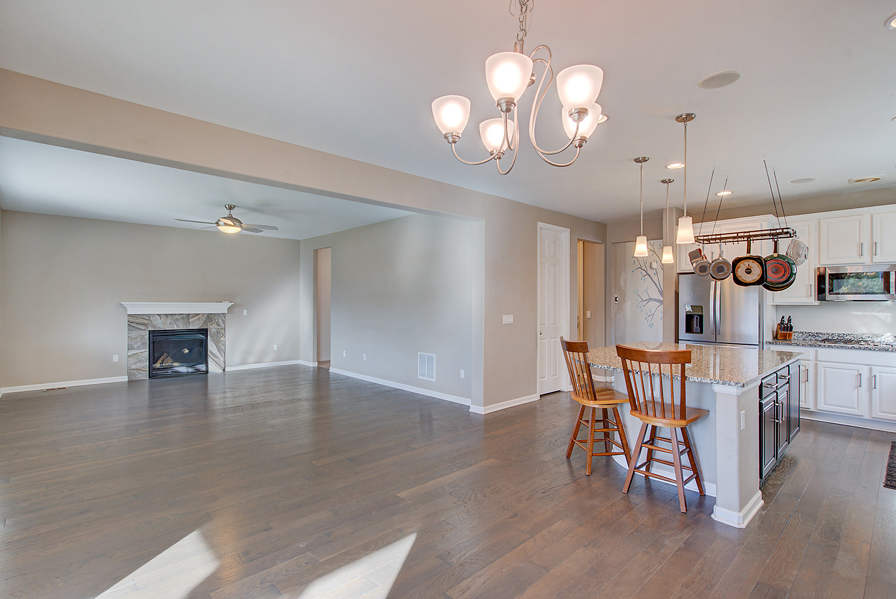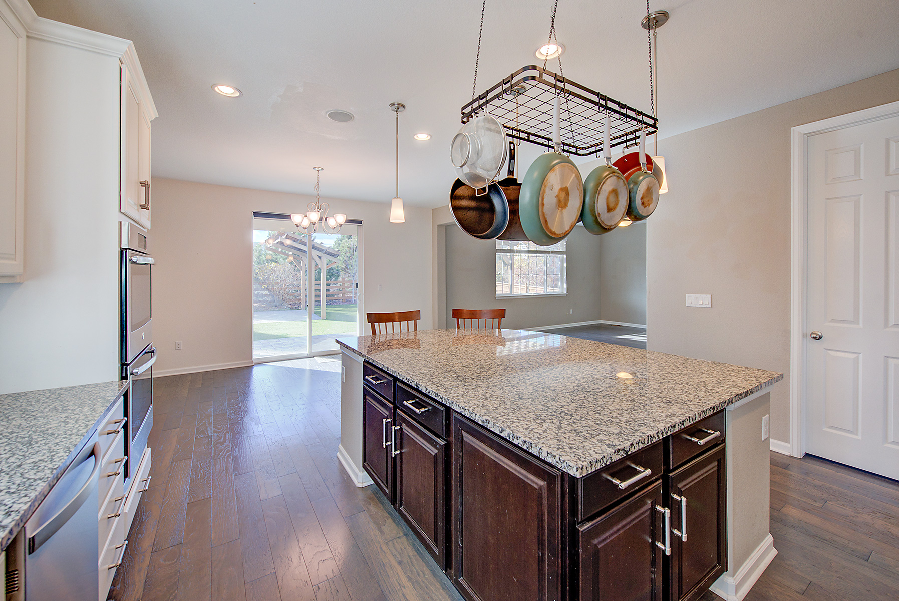 Stunning kitchen with huge island, granite, gas cooktop, double ovens and opens to dining and living room