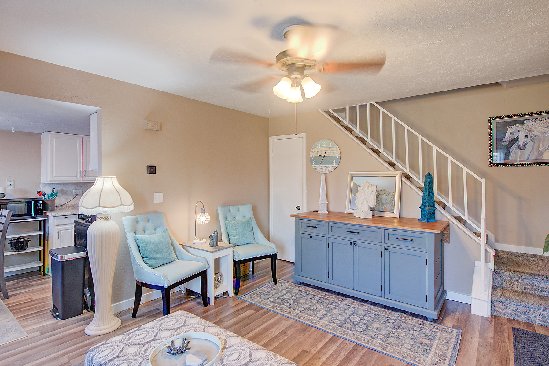 Newer vinyl plank flooring on main level and carpet on upper level